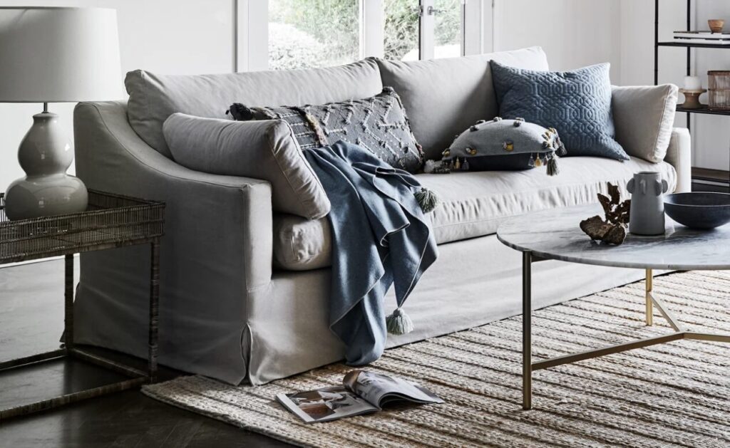 おすすめは、50×50cmサイズの、ふっくらとしたクッションを厳選すること。それだけで、ソファのくつろぎ感は格段に高まります。