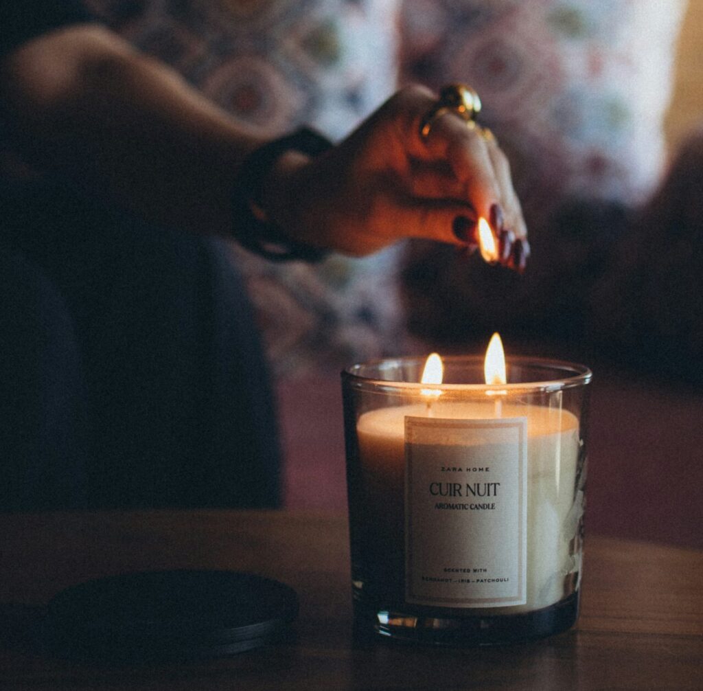 - 天然アロマオイルのキャンドルをリビングや寝室に置き、夜のくつろぎ時間に灯す