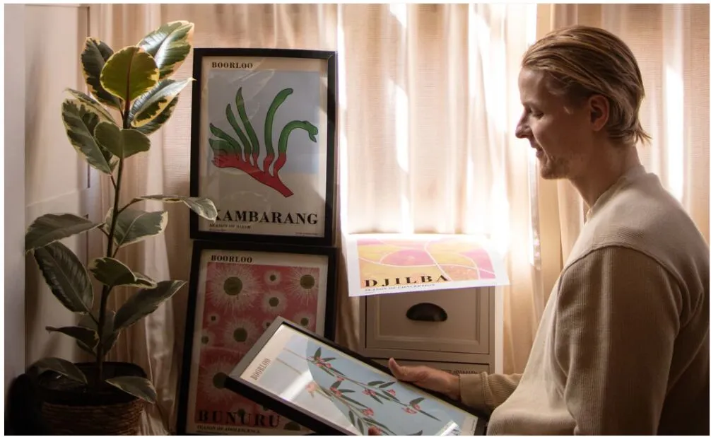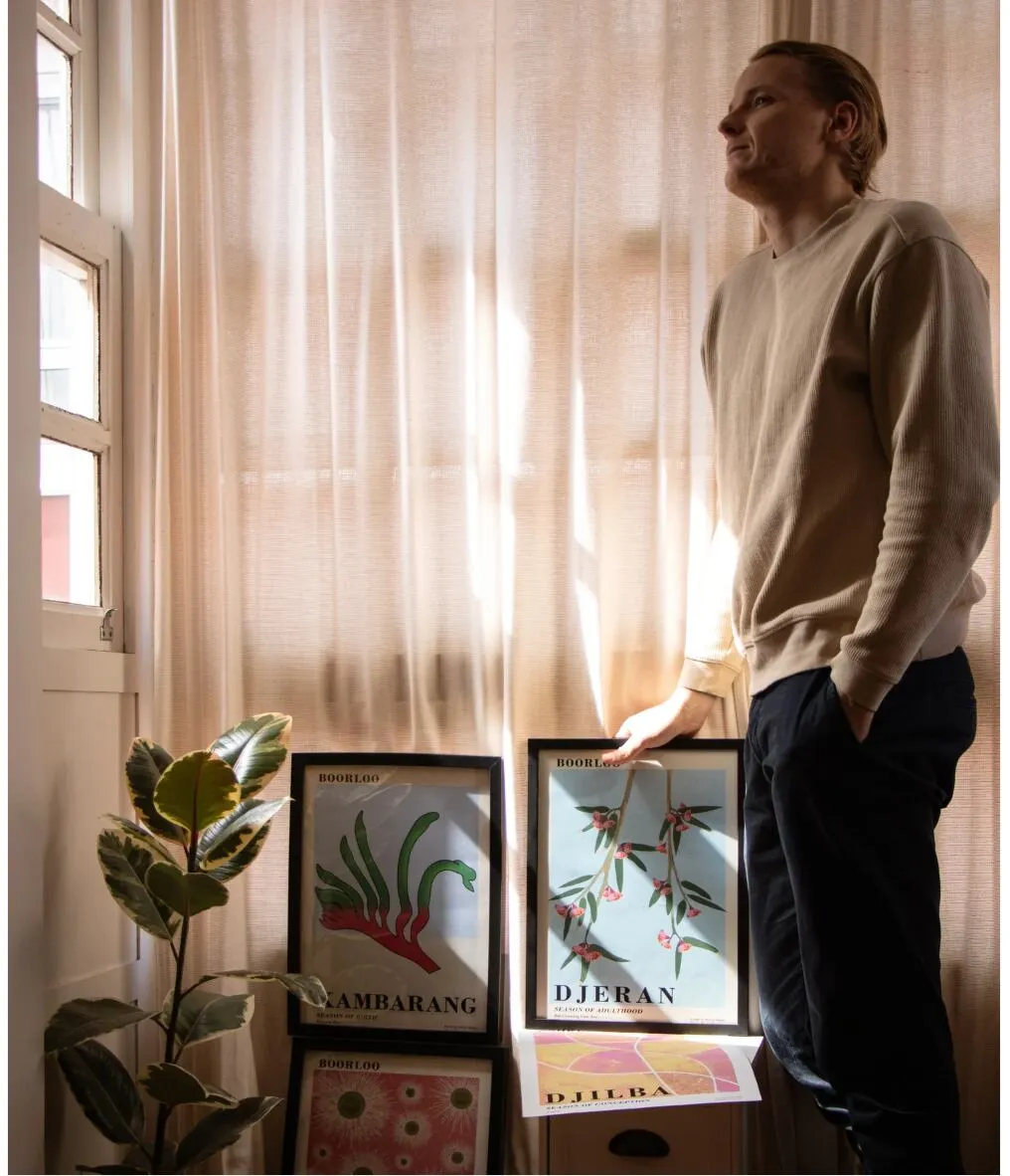 西オーストラリア州ブールルー(パース)で育ったジョシュアは、南西部に伝わるヌーンガーの6つの季節からインスピレーションを得ています。「ジェラン」は6部作のプリントシリーズのひとつで、それぞれの季節に咲く西オーストラリア原産の植物を題材としています。